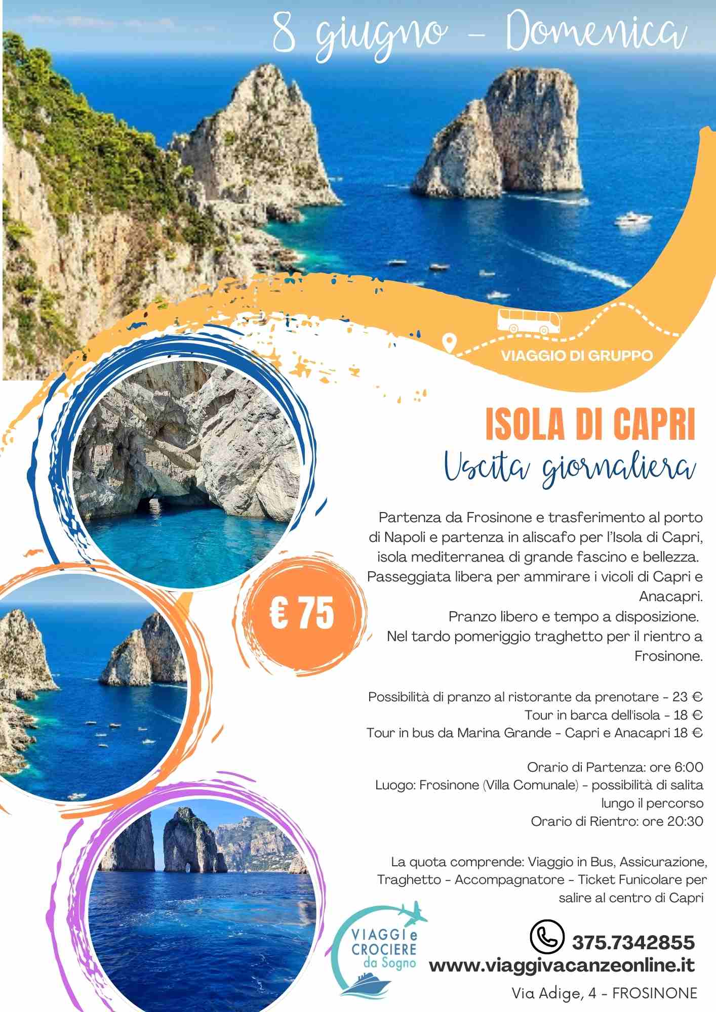Partenza da Frosinone e trasferimento al porto di Napoli e partenza in aliscafo per l’Isola di Capri, isola mediterranea di grande fascino e bellezza.