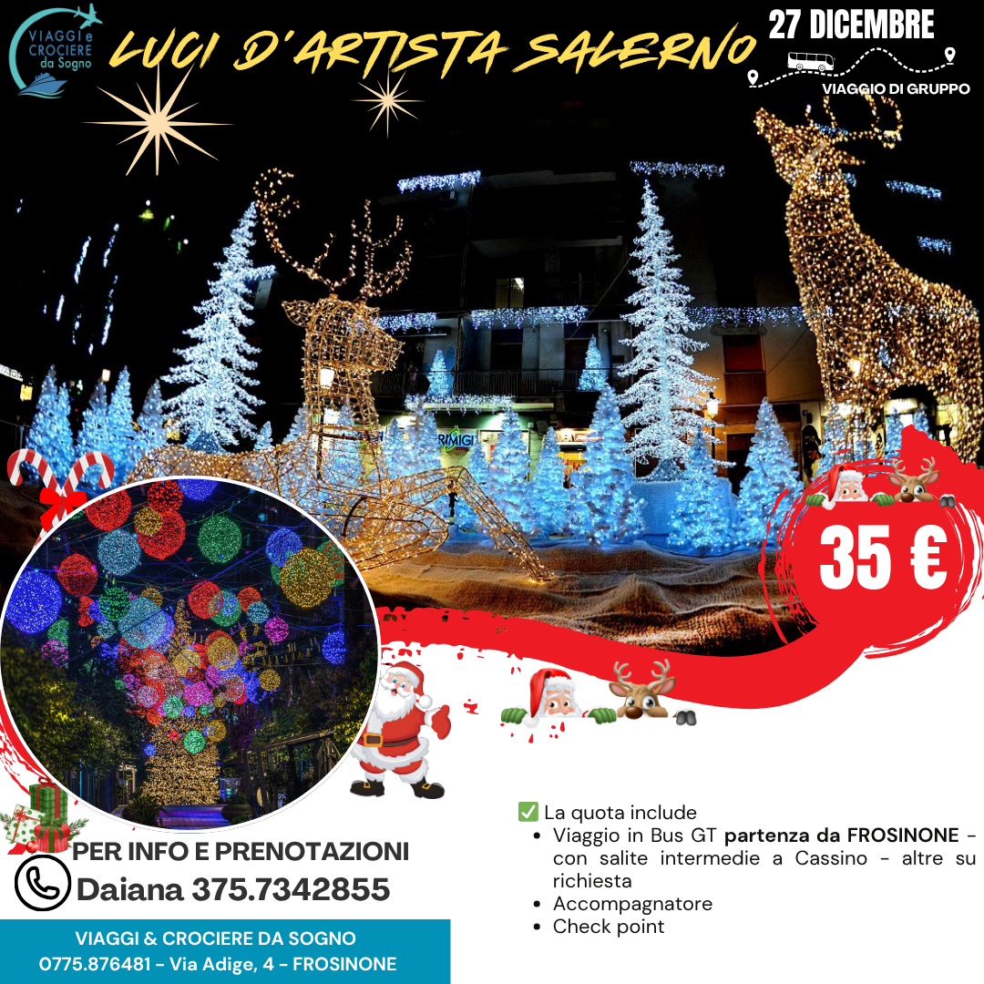 Sabato 27 dicembre 2025 parti con noi alla scoperta delle spettacolari Luci d’Artista di Salerno, uno degli eventi natalizi più attesi e amati d’Italia.